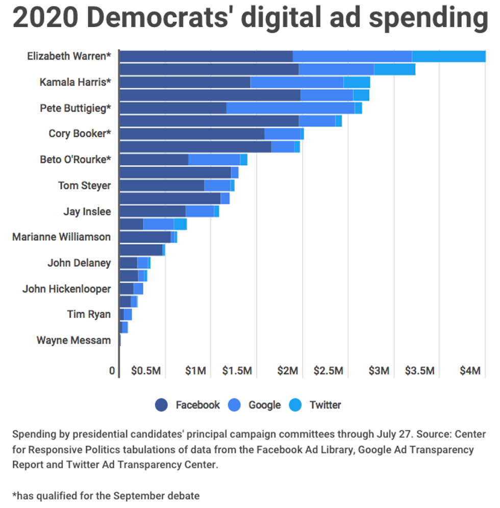 The Massachusetts senator has already qualified for the September debates, as have Vice President Joe Biden, South Bend Mayor Pete Buttigieg, former Rep. Beto O'Rourke, tech entrepreneur Andrew Yang and Sens. Cory Booker and Bernie Sanders. Each of those candidates has spent at least $1 million on digital ads so far.