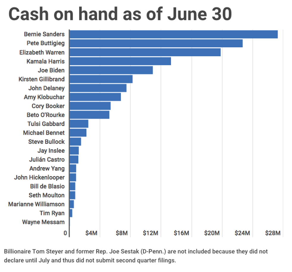 Steyer, along with former Rep. John Delaney (D-Md.) and Sen. Kirsten Gillibrand (D-N.Y.), can afford to continue running expensive digital ads even if they fail to gain ground in the polls. Their campaigns have the cash -- for Steyer and Delaney, due to self-funding, and for Gillibrand due to the $9.6 million that she transferred from her Senate committee.