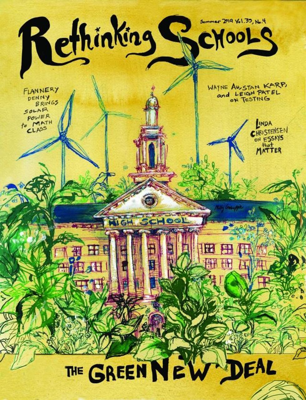 The curricular rethinking required by the Green New Deal needs to go on at all grade levels and in all disciplines. Rethinking Schools has featured stories about what this work looks like in early childhood education ["A Pedagogy for Ecology"], 3rd grade ["The (Young) People's Climate Conference"], middle school language arts ["Teaching to the Heart"], high school social studies ["Standing with Standing Rock"], high school chemistry ["Students 'Warrior Up' for Climate Justice"], and in this summer 2019 issue of Rethinking Schools, middle school math ["Solar Power Comes to Math Class"]. Most of these, and many more, have been collected at our Zinn Education Project's "Teach Climate Justice" campaign page.