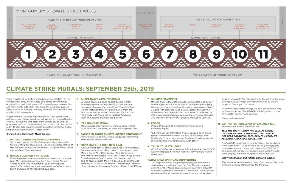 The Climate Strike street murals were part of a mass nonviolent direct action initiated by Idle No More SF Bay, Extinction Rebellion SF Bay, Diablo Rising Tide, 1000 Grandmothers, and the Society of Fearless Grandmothers, coming together as Climate Justice SF. Climate Justice SF issued a call to action, reading in part, "On September 25th, we name those responsible for destroying life as we know and need it. We'll begin weaving a new web of community-oriented and earth-based solutions, putting on large display the depth and breadth of our love for this planet and for all the generations to come. We are calling for you to speak the truth of our awakening to all those who are still caught in the nets of profit. Come disrupt business-as-usual in the offices of those institutions profiting off the destruction of the system of life we need to simply survive. We are inviting you to help create street murals, each one representing a part of the whole vision we have for our immediate transformation. Come dream, paint, and teach our community how we move forward at this moment in time."