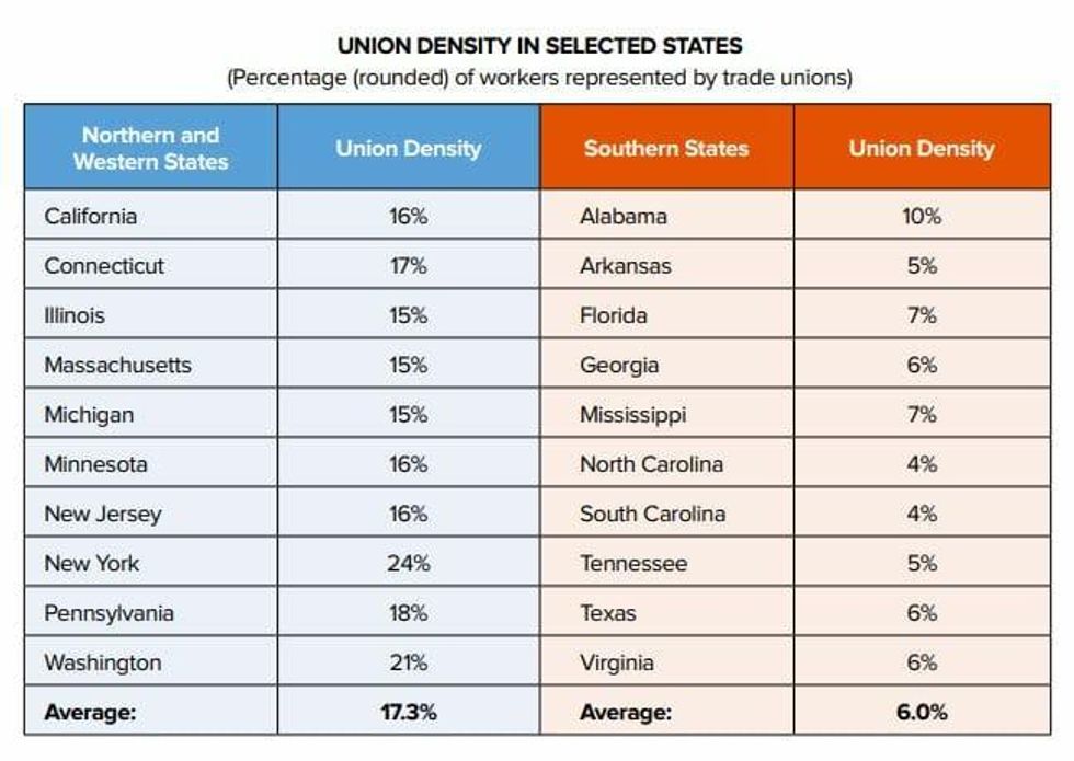 European workers and trade unions have a stake in the American South, too. Southern state government officials stress low wages, low taxes and low levels of union representation in their appeals to Europe-based multinational firms to invest in the South. This creates a temptation to relocate jobs to the U.S. South to escape European social standards.
