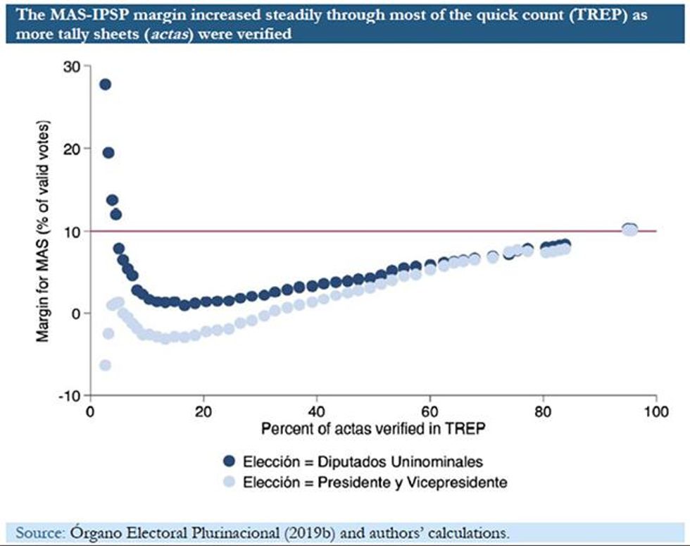 Why did it happen? The answer is simple and not that uncommon: the people in later-reporting areas were more pro-MAS (Morales's party, the Movement Toward Socialism) than those in areas that reported earlier. Hence the gradual and continuous rise in Morales's lead, in which the votes after the interruption put him over the top.