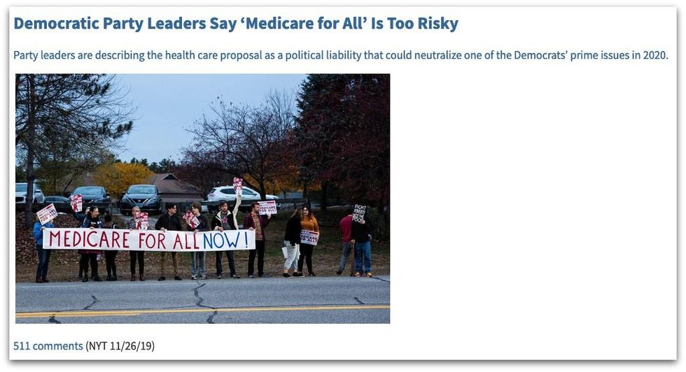 As one of the dozens of articles emanating from political establishment organs--including the Times, the Washington Post, and the Wall Street Journal--these pieces can be taken as an indicator of how much distress the growing movement to win Medicare for All is causing Washington insiders. And you can always count on the "paper of record" to find the appropriate "leaders," "officials," and "staffers" to weigh in with appropriate gravitas.