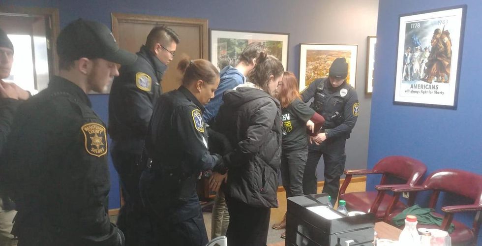Meanwhile, here in Michigan, I was at a retreat with local elected officials working on sustainable public transport options for Washtenaw County when "ARRESTS HAVE HAPPENED" lit up my phone screen. I watched with bated breath as an image downloaded. My friends were being handcuffed by police officers in our Congresswoman's office.