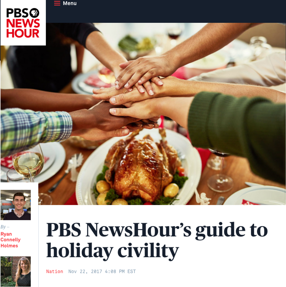 In November, the Washington Post's "Have Different Politics From Your Family? Here's How to Survive the Holidays" (11/25/19) offered strategies on how to "avoid detonating the room" with opinions. Last year, the New York Times (11/20/18) instructed readers on "surviving" Thanksgiving, with tips including "don't mention President Trump" and "find the cutest thing in the room and home in." The year before, PBS NewsHour (11/22/17) even produced a printable placemat with prescriptions for "civil" holiday conduct, with advice on questions like "how to end a conversation that gets heated or politically charged," and "should we be having these conversations at all?"