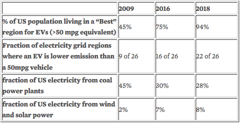 The change from our first analysis of global warming emissions from EVs and gasoline vehicles in 2012 (using 2009 powerplant data) is even more impressive. In our initial assessment, less than half the US lived where an EV produced fewer emissions than a 50 mpg car, while now nearly all of the US falls in that category. The improvement has been driven partially by increasing EV efficiency, but the major contribution has been from the reduction in electricity generation from coal power plants. Electricity from coal has fallen from 45% to 28% in less than a decade. At the same time, solar and wind electricity has grown from less than 2% to 8% in 2018.
