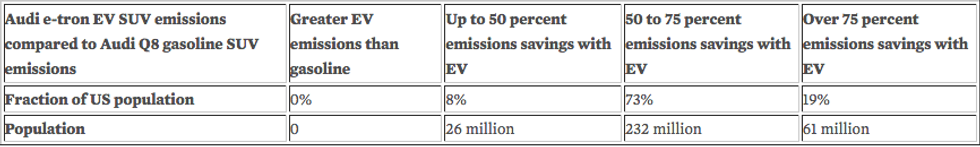 Take for example the Audi e-tron EV SUV: using 0.46 kWh per mile, it is one of the least efficient EVs available. However, the most comparable gasoline model, the Audi Q8 gasoline-fueled SUV is also inefficient for a gasoline vehicle, with a fuel economy rating of 18 mpg. The Audi e-tron electric SUV will produce less emissions than the gasoline-powered Audi Q8 while driving, even on the dirtiest electric grids in the US. And on the cleanest grids, the electric SUV is responsible for less than a quarter of the global warming emissions of the gasoline SUV. For more than 90 percent of the population, driving the electric version of this vehicle will produce less than half the global warming emissions of the gasoline model.