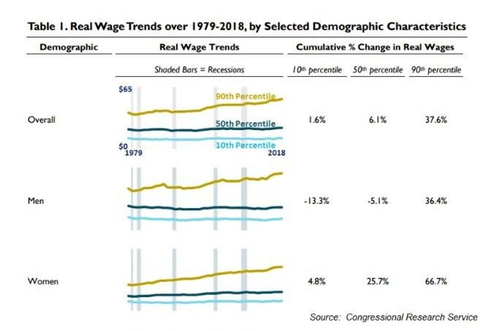 Yes, wages are indeed going up, according to the Bureau of Labor and Statistics. But much of that is due to minimum wage increases enacted at the state and local level. As seen in the graphs below, the median wage for men has remained flat and is still less now than it was in 1979.