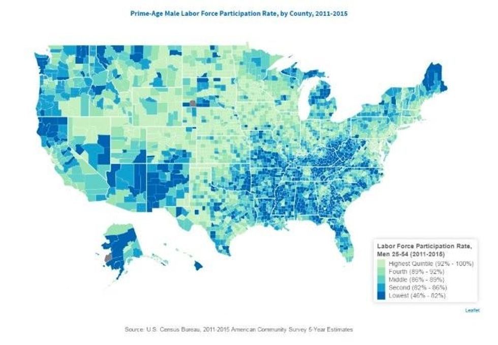 Compounding this, there is also an alarming number of working-aged men who have checked out of the labor force entirely. Most of these men do not have college degrees; they also predominantly live in a handful of rural, low-income regions across the country:
