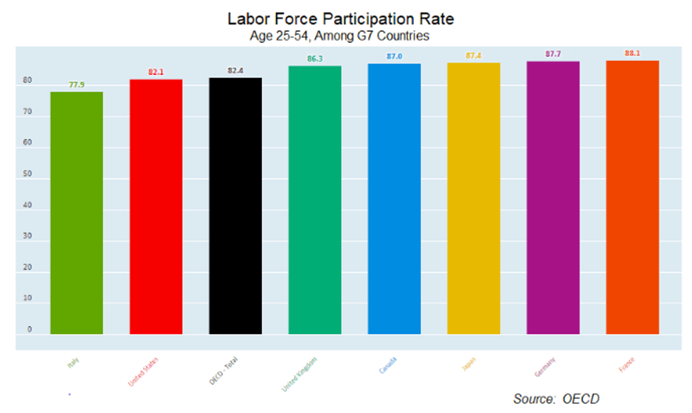 In fact, as highlighted in the graph below, the United States trails behind most G7 countries in labor force participation among prime working age (25-54) adults. American exceptionalism, indeed.