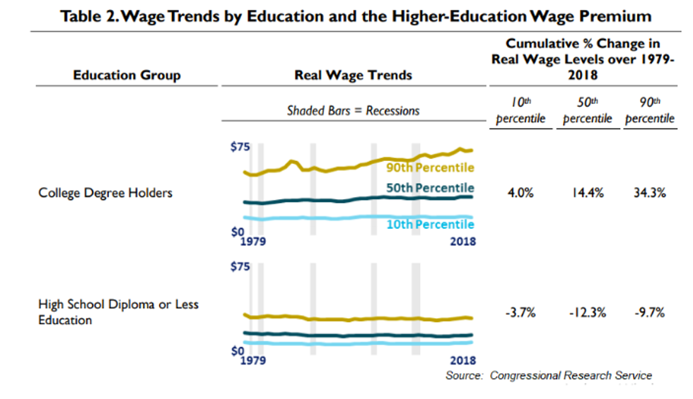 When we look at just non-college educated workers--what we traditionally think of as "blue collar" workers--the reality is even starker. Since 1979, the median wage for this group has gone down 12.3 percent.
