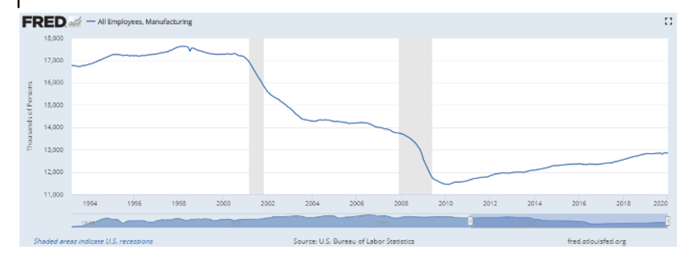 And what about Trump's claims of a return of manufacturing jobs? The reality is that there has been slow growth in the manufacturing sector, and this growth is simply a continuation of the post-recession growth rate of the Obama Administration. We still have not returned to pre-recession manufacturing job levels. But we are quite a distance from the "free trade deal" era of the early 1990s, the one Trump is singularly focused on blaming for factory closures.
