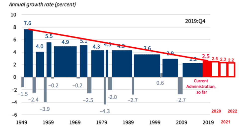 Perhaps the best reality-check is GDP growth. Despite Trump promising "4%, 5%, or even 6%!" GDP growth, it hasn't nudged in any meaningful way and Trump's own White House Council of Economic Advisers is forecasting more of the same-old, same-old in the future: