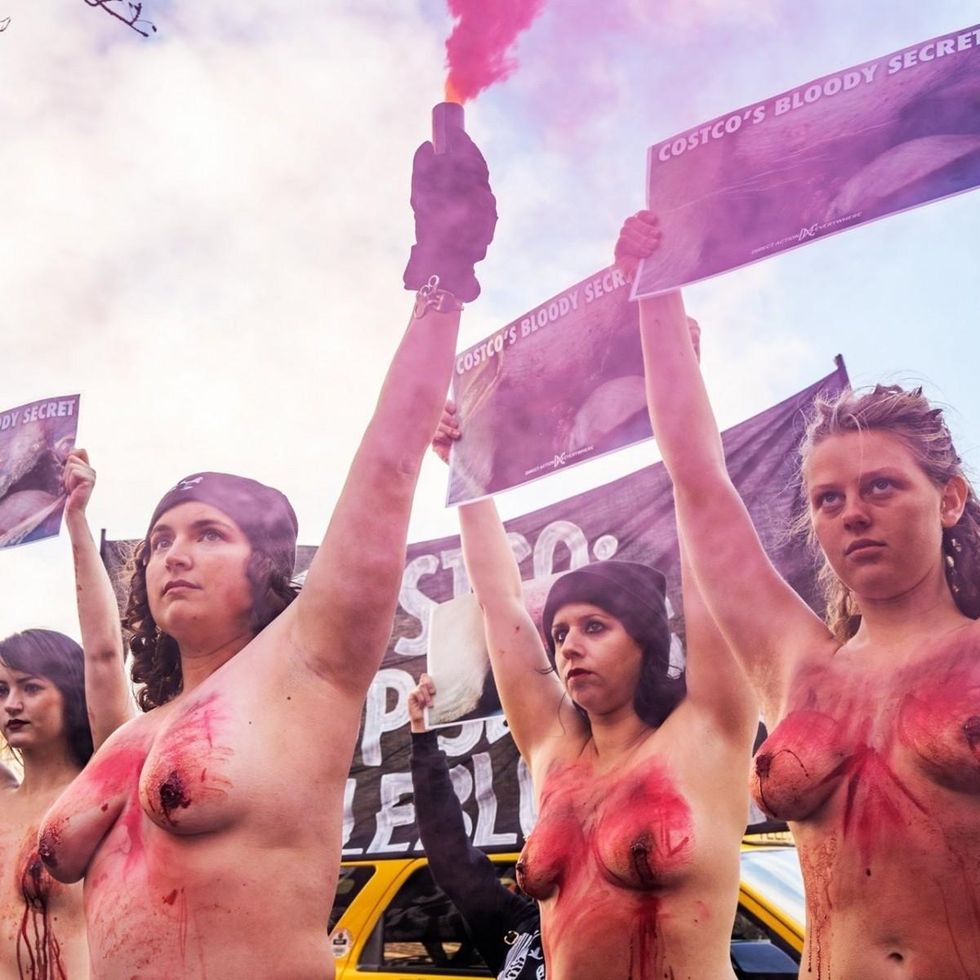 Early in the morning, I and a dozen other women met in a second-story walkup San Fransisco apartment, took a deep breath and removed our shirts. Using latex makeup, fake blood, and red lipstick, we painted our nipples to resemble the disfigurement we've seen in factory pig farms. We walked a short distance to a Costco warehouse just as large steel gates closed across the entrance, poetically separating customers from several dozen grassroots activists displaying our bodies and signs reading "Costco's Bloody Secret."