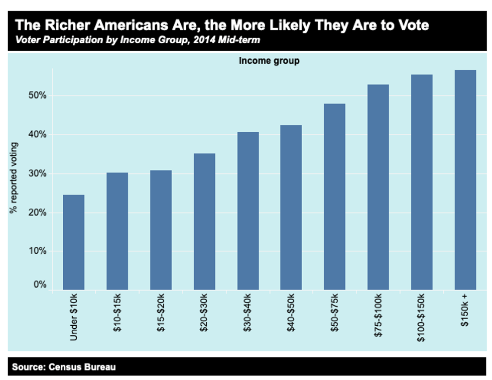 As a result, the richer the American, the likelier they are to vote. According to the most recent Census data, voters with household income of more than $150,000 had a 56.6 percent participation rate in the 2014 mid-terms, compared to just 31 percent for those making $15,000 to $20,000.