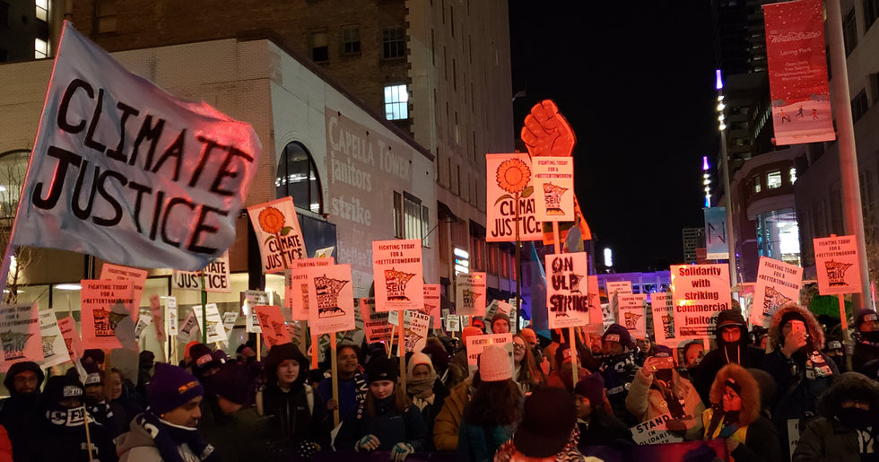 On Thursday February 27 thousands of Minneapolis cleaning workers walked off their jobs and struck their downtown commercial high-rises. Among their key demands was that their employers take action on climate change. It was one of the first--as far as I have been able to discover, the very first--union sanctioned strike in the U.S. for climate protection demands.