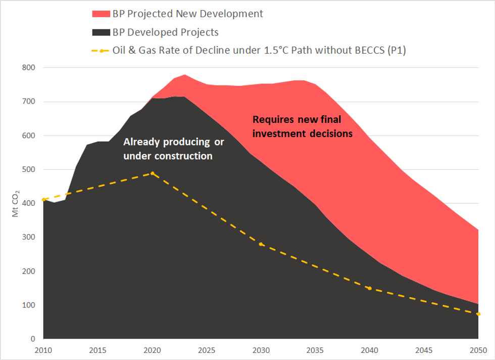 Figure 2: Projected CO2 Emissions from BP Oil and Gas, with and without New Development, vs. 1.5oC Rate of Oil and Gas Decline