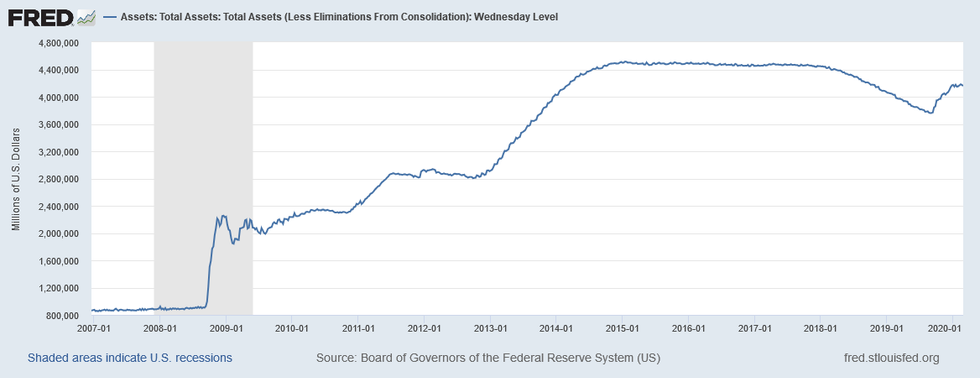 Then in October 2014 the plateau begins when the Fed made its final massive purchases of private sector securities. The Fed maintained its bloated balance sheet of $4 trillion worth of assets until late 2017 when, believing that financial markets could finally stand on their own, it began selling off its holdings. That's when the blue line starts to gradually slope down through 2018 and most of 2019.