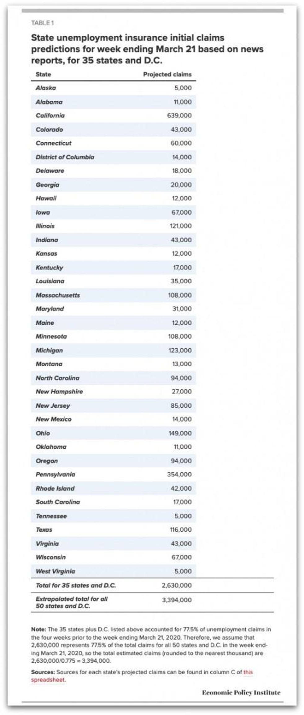 The new analysis shows that last week's likely spike in unemployment claims due to the current coronavirus pandemic is unprecedented in U.S. history. (Image: Economic Policy Institute)