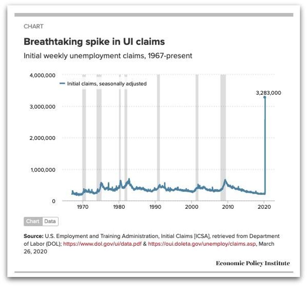 We just got the first piece of government labor market data that really shows--in a breathtaking manner--the impact the coronavirus shock is having on the labor market. The data are last week's initial unemployment insurance (UI) claims. Initial UI claims jumped from 211,000 three weeks ago to 282,000 two weeks ago to 3.3 million last week. That is nearly a 1500% increase in two weeks. I have been a labor economist for a very long time and I have never seen anything like this. This is a case where a picture is worth a thousand words.