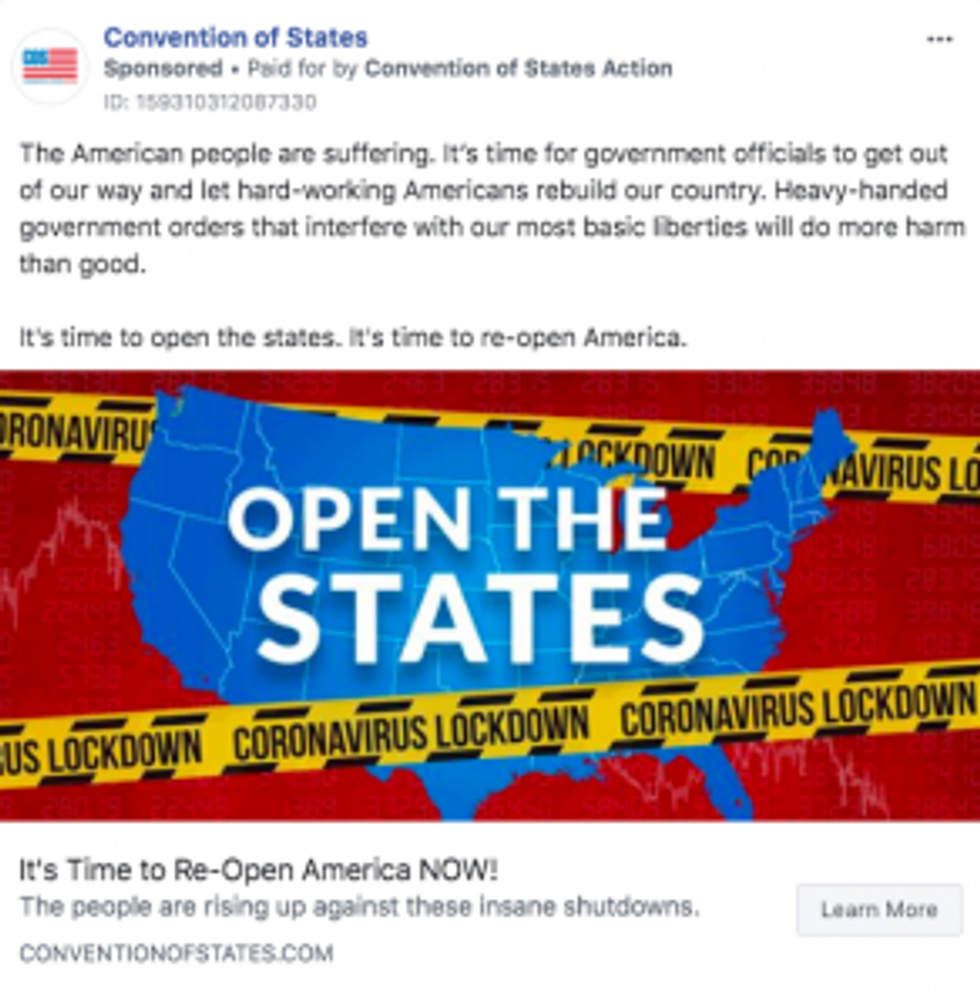 Convention of States Action (COSA), another conservative group in billionaire industrialist Koch's funding network, is also helping mobilize the protests, which have sprung up in states such as Michigan, North Carolina, Ohio, and Wisconsin and have seen many participants not wearing masks or socially distancing. COSA is a project of the right-wing nonprofit, Citizens for Self-Governance, and has a web page devoted to its new initiative, "Open the States."