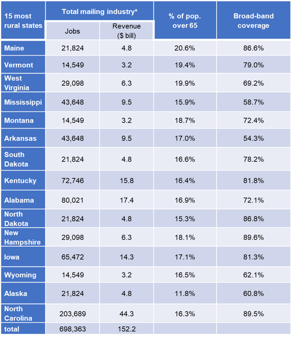 In the 15 states with the largest share of their population in rural areas, more than 75,000 people work directly for the Postal Service -- more than are employed in many other major job categories. The total mailing industry employs nearly 700,000 people and generates more than $150 billion in revenue per year in these heavily rural states. Twelve of these states have larger than average shares of 65 and older residents, a group that tends to rely heavily on USPS for medicine, bill paying, and other services.