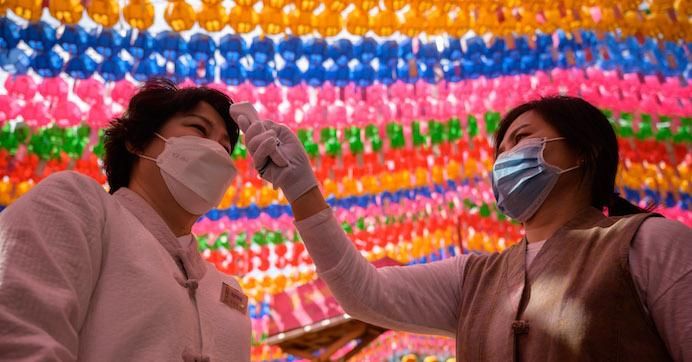 Worshippers wearing face masks have their temperature taken as they attend a prayer ceremony entitled 'overcoming and healing the COVID-19 coronavirus', while marking Buhha's birthday at the Jogye buddhist temple in Seoul on April 30, 2020. (Photo: Ed Jones/AFP via Getty Images)
