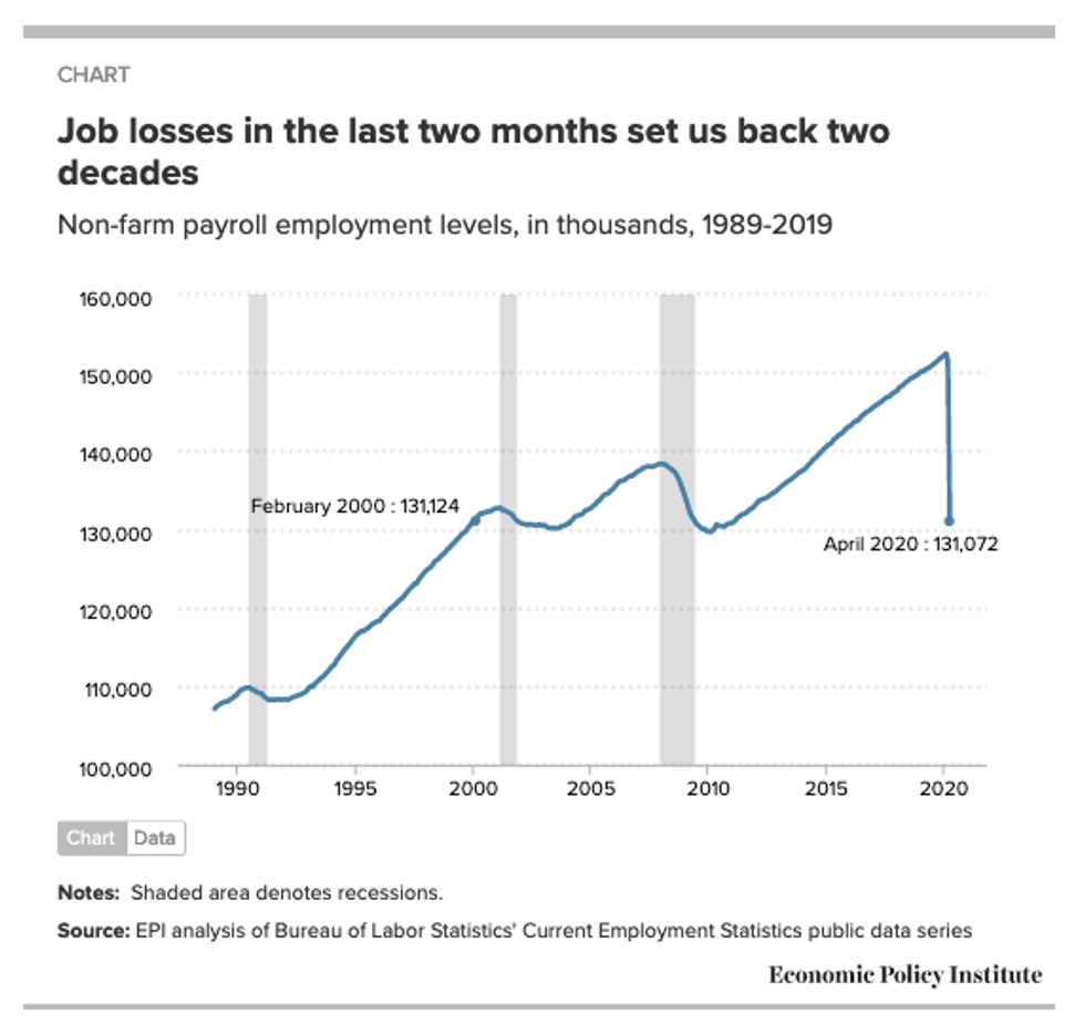 After a sharp fall in March, payroll employment dropped like a rock in April. I struggle to even put into words how large this drop is. It's as if all the gains in employment since 2000 were wiped out. Total job losses over the last two months would fill all 30 currently empty Major League Baseball stadiums 16 times over. It's as if all the jobs in all of the states beginning with the letter "M" simply disappeared in the last month. That's all the jobs in Maine, Maryland, Massachusetts, Michigan, Minnesota, Mississippi, Missouri, and Montana combined.