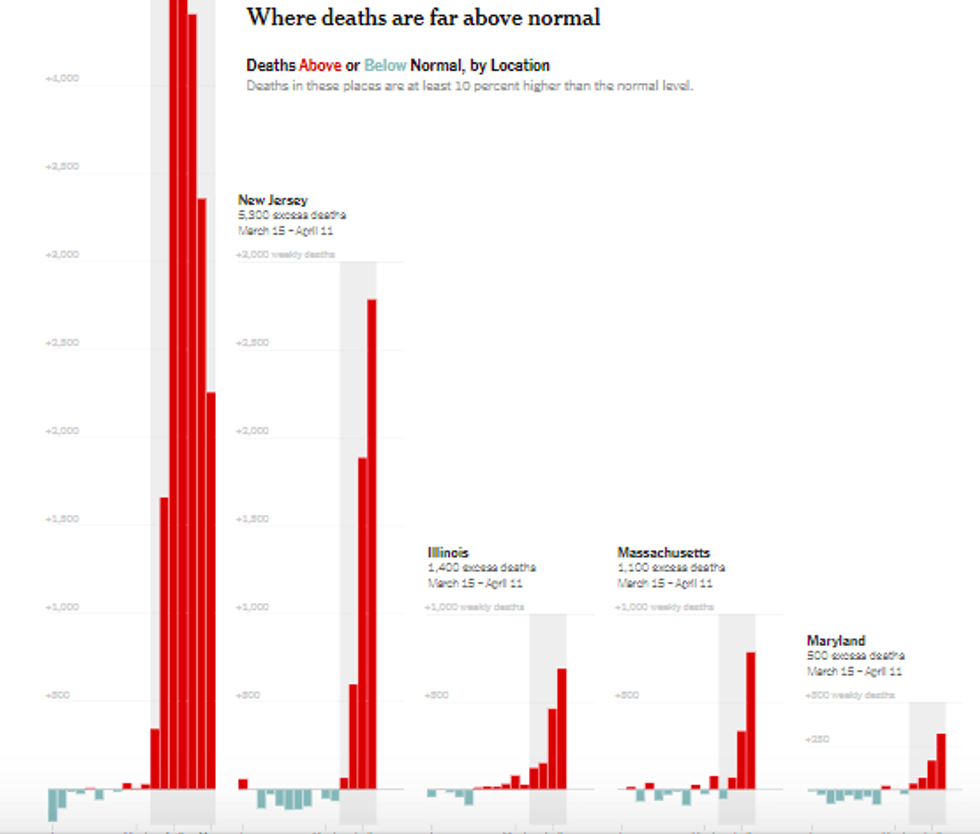 You can't help but notice that one locale--that's New York City--has far more excess deaths than anyplace else: 23,000 by the Times' count. That dwarfs the 5,300 in New Jersey, the 1,400 in Illinois, the 1,100 in Massachusetts and the 500 in Maryland. Colorado, Vermont and Wyoming have hardly any deaths to speak of, compared to New York City.