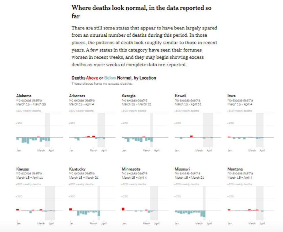 And plenty of people looked at this feature and drew the obvious, incorrect conclusion. On Twitter, @Radxraymd (5/6/20) cited the Times' work while asking: "Why do so few states have excess deaths? Many have 'negative' excess deaths." @mitrebox (5/7/20) used the Times to announce, "Fun Fact: In Georgia, deaths are actually below normal." @varnergreg (5/7/20) pointed out: "In Alabama, deaths totals are actually below the historical trend. But look at NYC, 6x normal rate."