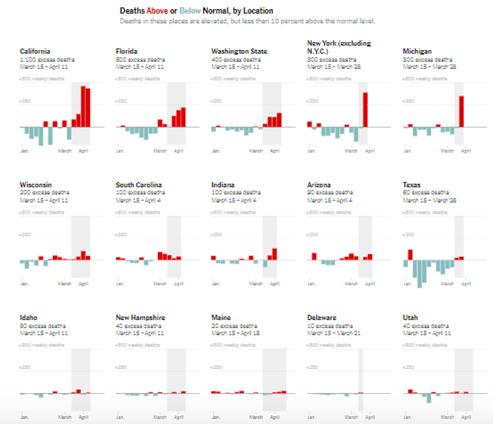 The figures for excess deaths for New York City cover March 15-May 2, only a few days before the chart was published. The other "far above normal" states feature figures from March 15-April 11, or March 15-April 4--leaving out the three or four worst weeks of the pandemic. In the "slightly above normal" states, the time frames end on April 11, April 4 or March 28. In the places "where deaths look normal," the latest dates range from April 11 back to March 21. (Three states have "no reliable data for total deaths since March 15.")