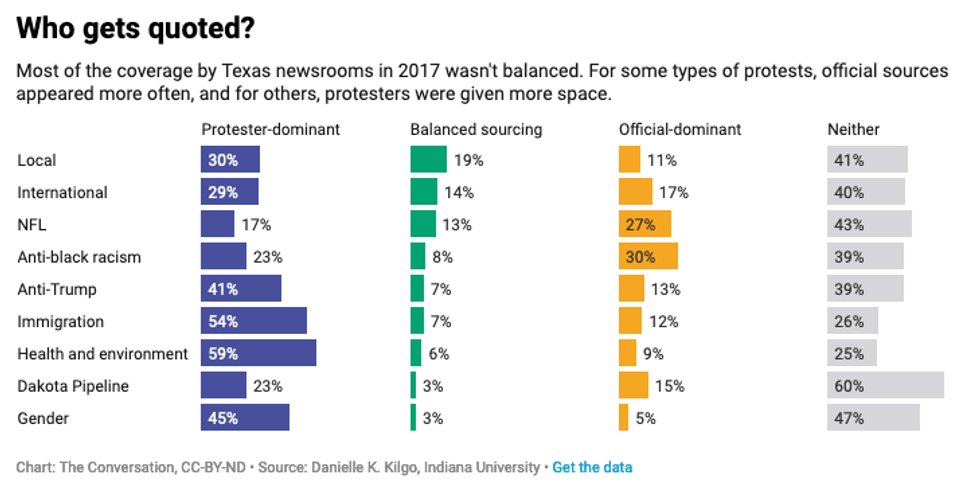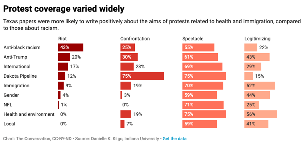 To do so, we analyzed the framing of protest reporting from newspapers in Texas. The state's size and diversity made it a good proxy for the country at large.