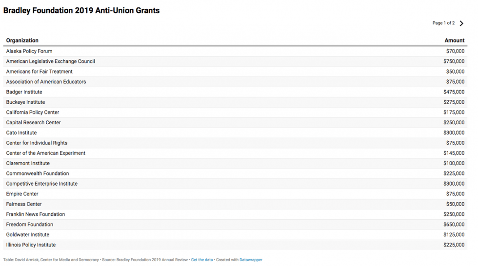 The Bradley Foundation bankrolled the union-busting activities of thirty groups in 2019. Bradley's massive investment in anti-union groups to further its partisan goal of weakening the Democratic Party and winning Republican "unified" control in the states, including $7.2 million in 2019 alone, rivals Charles Koch's anti-union campaign over the last decade.