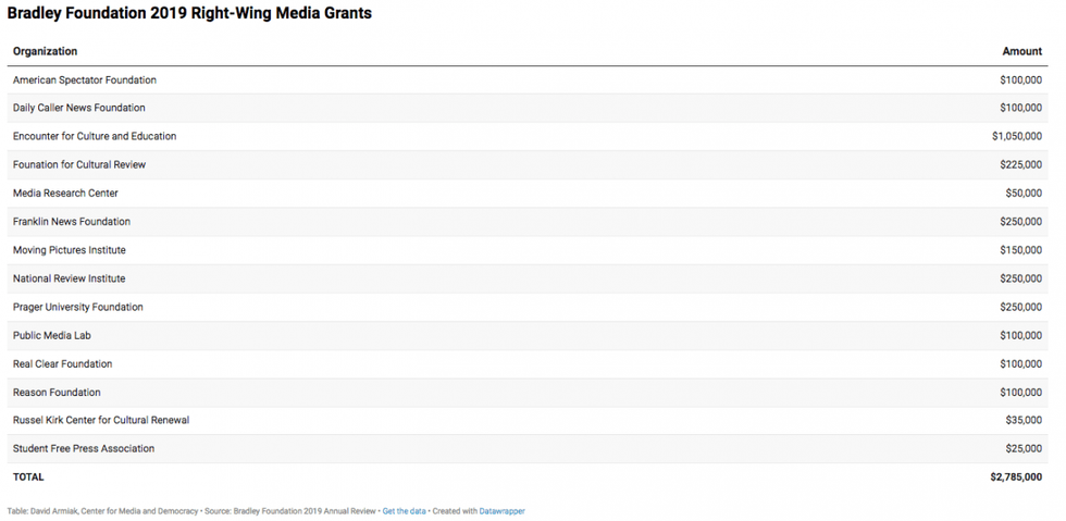 Bradley details $2.8 million in grants to right-wing media outlets in 2019 in its annual review. $1,050,000 went to Encounter for Culture and Education, the publisher of Encounter Books, which Bradley helped found in 1998.
