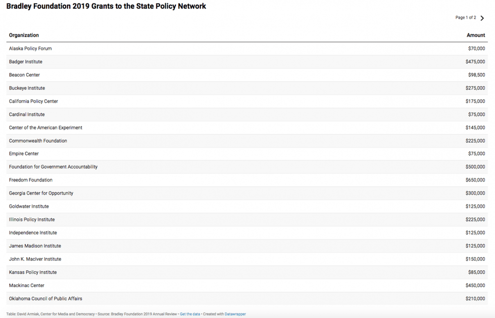 Bradley, one of the largest funders of right-wing infrastructure in the United States with $854.2 million in assets as of December 2018, states that it distributed $42.1 million in grants in 2019, a marginal increase over the $40.1 million it gave out in 2018.