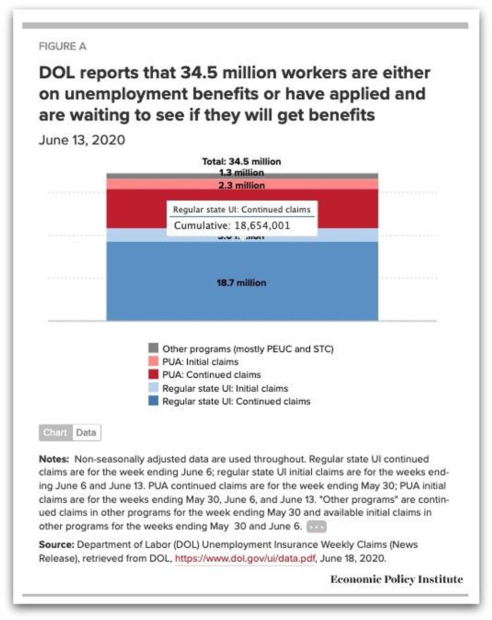 A total of 18.7 million workers had made it through at least the first round of regular state UI processing as of June 6 (these are known as "continued claims" or "insured unemployment"), and 3.0 million had filed initial UI claims on top of that, but had not yet made it through the first round of processing. And, 9.3 million workers had made it through at least the first round of PUA processing by May 30, and 2.3 million had filed initial PUA claims on top of that but had not yet made it through the first round of processing. Even further, by May 30, another 1.3 million workers had made it through at least the first round of processing in one of the other unemployment benefits programs, or had filed initial claims in other programs on top of that. (The largest of the other programs are Pandemic Emergency Unemployment Compensation--which is available to workers who have exhausted their regular state benefits--and Short-Time Compensation, which is an alternative to layoffs where employers reduce work hours rather than laying off workers, and workers get partial benefits.) Altogether, that's 34.5 million workers who are either on unemployment benefits or who have applied very recently and are waiting to see if they will get benefits. That is more than one in five U.S. workers.