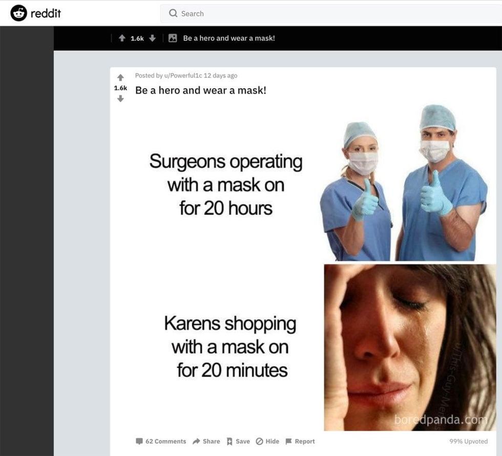 This is an example of a polarizing post that springboards off the meme of "Karens" (entitled White women who are passive-aggressively racist). It belittles and ridicules them and implies that anyone who doesn't mask is either racist, pathetically fragile, or both. It also gratuitously polarizes the wearing of masks by creating an "us" (virtuous, anti-racist mask-wearers) versus "them" (selfish, racist mask-resisters) dynamic. Such divisiveness hardens the battle lines that Trump has drawn and embitters opposing factions in ways that make the pandemic that much harder to overcome.