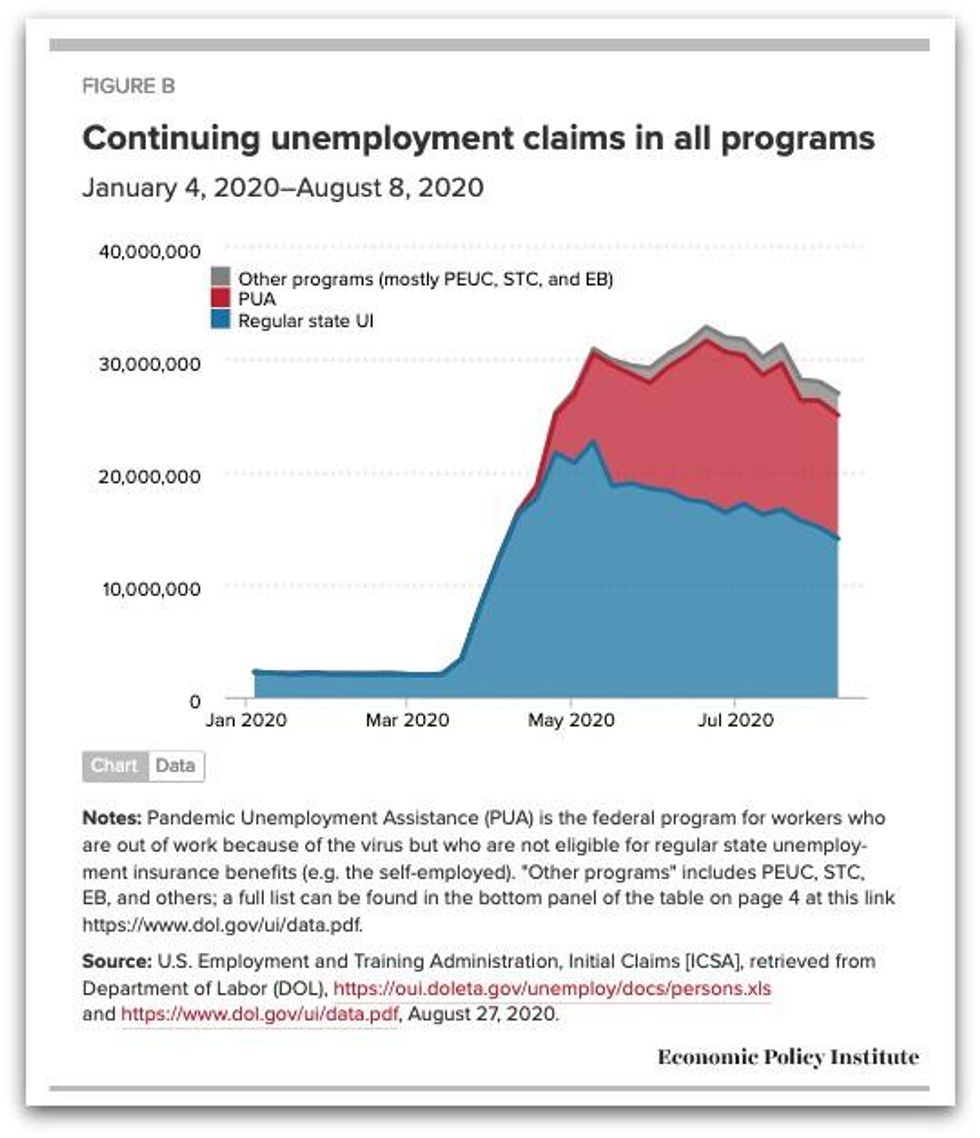 Figure A combines the most recent data on both continuing claims and initial claims to get a measure of the total number of people "on" unemployment benefits as of August 22. DOL numbers indicate that right now, 28.8 million workers are either on unemployment benefits, have been approved and are waiting for benefits, or have applied recently and are waiting to get approved. But importantly, Figure A provides an upper bound on the number of people "on" UI, for two reasons: (1) Some individuals may be being counted twice. Regular state UI and PUA claims should be non-overlapping--that is how DOL has directed state agencies to report them-- but some individuals may be erroneously counted as being in both programs; (2) Some states are likely including some back weeks in their continuing PUA claims, which would also lead to double counting (the discussion around Figure 3 in this paper covers this issue well).