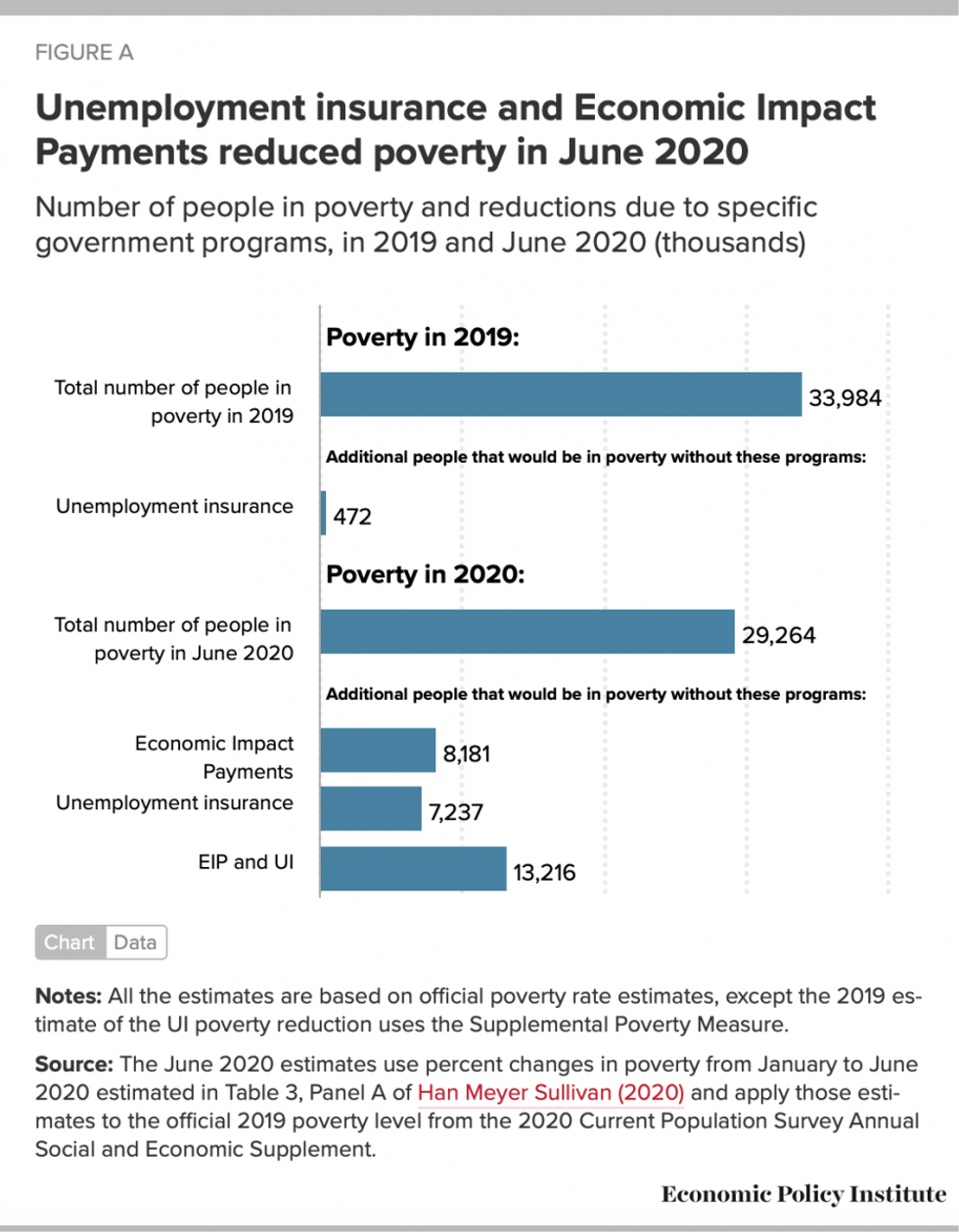 In any case, it is clear that the stimulus payment and UI expansions in March dramatically reduced poverty during the initial months of the pandemic. Unfortunately, the $600 supplementary UI payment expired in July. Senate Republicans blocking its renewal have increased poverty and hardship for millions of families in the middle of a pandemic that has caused widespread job loss and health devastation.