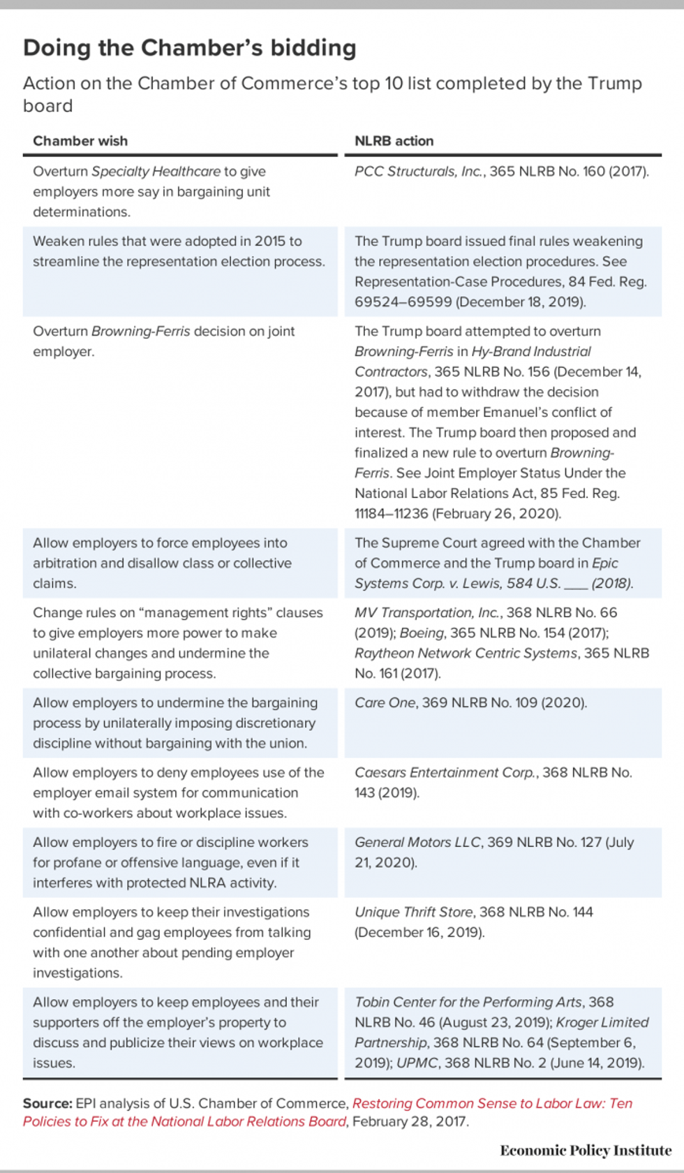 Under President Trump, the National Labor Relations Board (NLRB) has systematically rolled back workers' rights under the National Labor Relations Act (NLRA), which provides workers the fundamental right to organize and bargain collectively. The Trump NLRB has engaged in an unprecedented number of rulemakings aimed at overturning existing worker protections, including narrowing the joint-employer standard under the NLRA and obstructing workers' right to fair union elections. Further, the Trump NLRB has issued a series of significant decisions weakening worker protections such as hindering workers' ability to organize during non-work hours and allowing the misclassification of workers. As a result, the Trump NLRB has completed the wish list of the U.S. Chamber of Commerce--the largest corporate lobbying firm in the U.S.