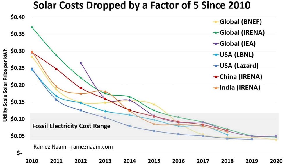 Author and technologist Remez Naam illustrates the dramatic plummeting of solar energy prices in this graph: