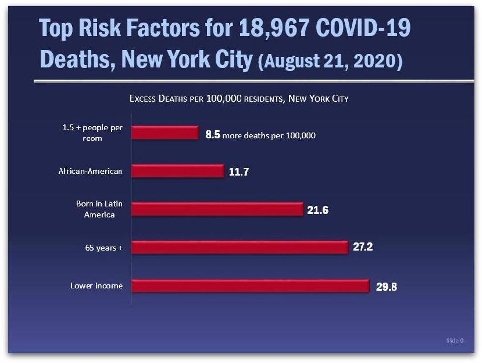 Our initial New York City report, "COVID's Class War" (July 28, 2020) shows that neighborhood median income has the strongest correlation with COVID-19 death rates per zip code. Since then, NYC has released more data for a total of 18,967 deaths by zip code as of August 21. Please note, the average NYC census tract neighborhood in our data base is 41.9% white, 27.3% Hispanic (19.1% born in Latin America), 25.7% Black, 14.3% Asian, 14.3% aged 65 and older, and 1.3% of households with 1.5 or more people per room.