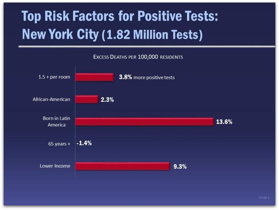 This updated NYC database for the first time also has the percentages of positive COVID-19 deaths per zip code covering more than 1.5 million tests. Our multiple regression reveals** that neighborhoods with about one-third more residents who were born in Latin America faced the most risk with 13.6 percent more positive test results than the average New York neighborhood. Poorer neighborhoods had a 9.3 percent higher rate than an average income neighborhood. It is not difficult to understand that recent immigrants, especially if undocumented, are far less likely to engage with official public health structures until they have no choice for fear of being deported. At the same time they are ineligible for federal benefits and are far more likely to be out in public, either engaged in work or seeking work.