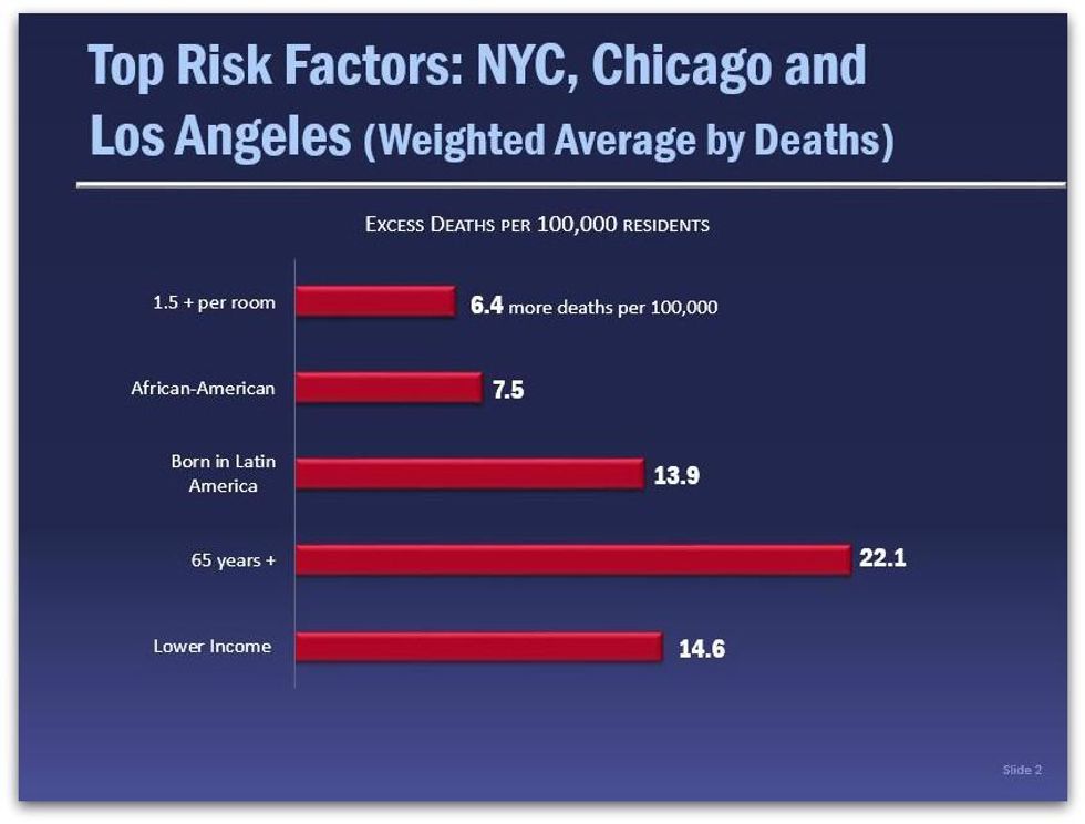 To gain a more accurate approximation, we use statistical measures of neighborhoods (census tracts) to estimate the independent impacts of race, class, age, housing conditions, and immigration status on who is likely to die from the virus. At the Labor Institute, we have compiled and tested four data sets encompassing positive test and death rates in New York City, and deaths rates in Chicago and Los Angeles. While our results are only statistical estimates due to the lack of direct income/occupational data for each COVID-19 fatality, the findings strongly suggest that Dr. Olden is correct: Income has an enormous impact on who gets sick and who dies.