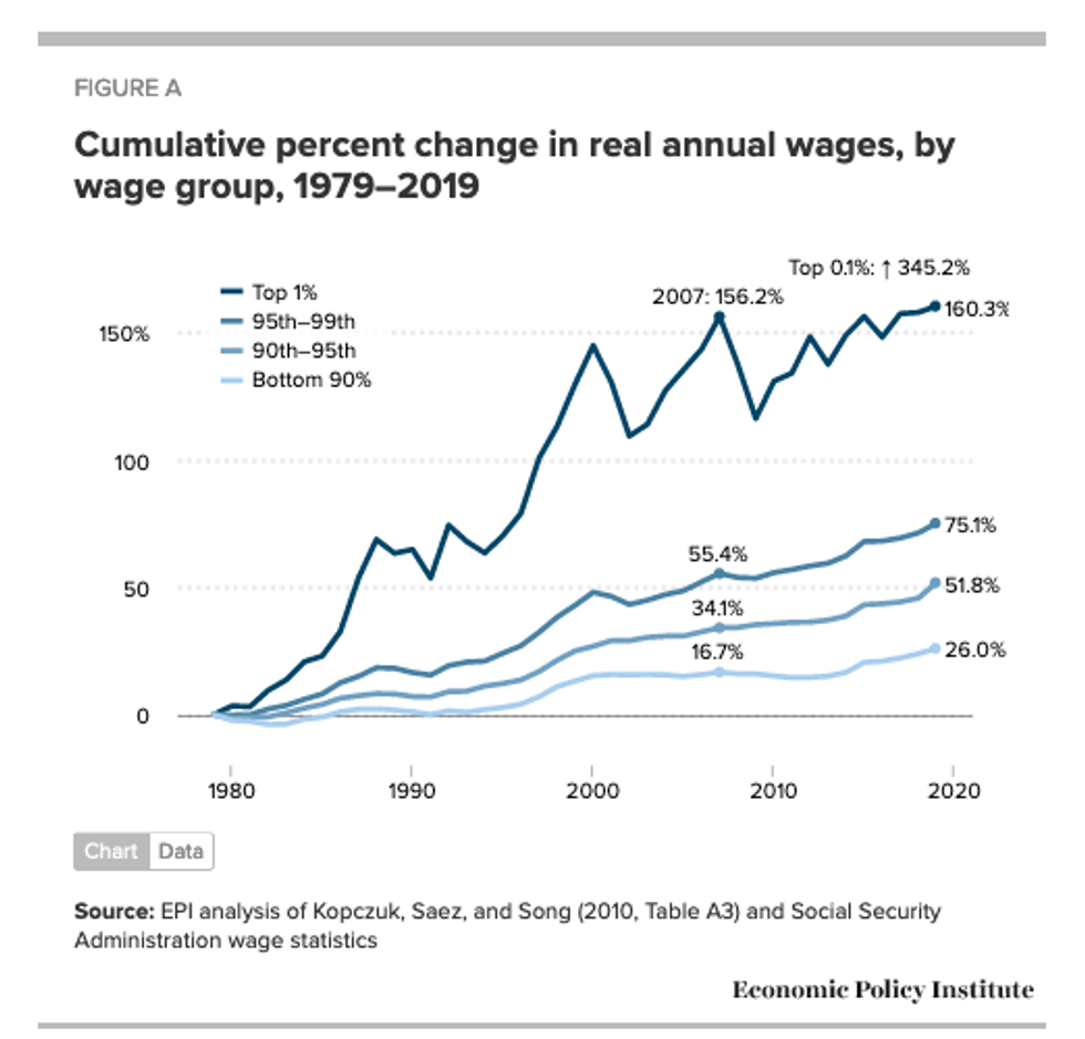 This disparity in wage growth reflects a sharp long-term rise in the share of total wages earned by those in the top 1.0% and 0.1%.