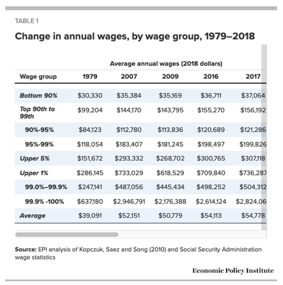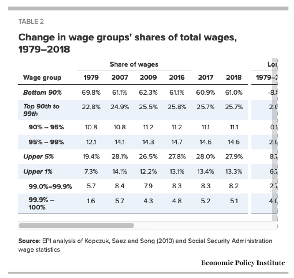 Newly available wage data tells a familiar story: In every period since 1979, wages for the bottom 90% were continuously redistributed upwards to the top 10% and frequently to the very highest 1.0% and 0.1%.