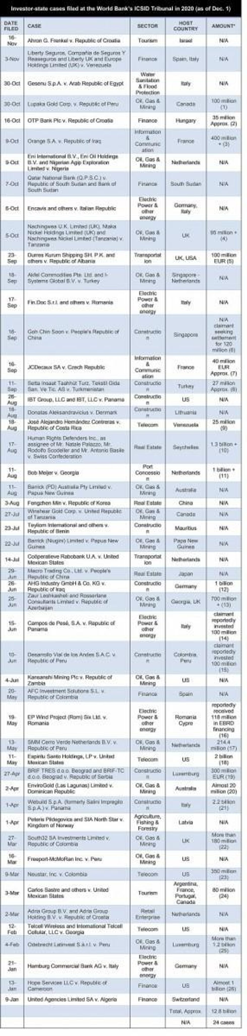 In 2020, the World Bank's International Center for the Settlement of Investment Disputes (ICSID) registered at least 51 new known ISDS cases. In several cases, the demands are truly staggering. A U.S. telecom company is suing Mexico under NAFTA for $2 billion. An infamous Brazilian construction company is suing Peru for more than $ 1.2 billion (using a Luxembourg-Peru bilateral investment treaty). A Dutch port company is suing Georgia for $1 billion. And an Italian construction company filed a suit against Panama for $2.2 billion. (See full list of 2020 cases in table below)