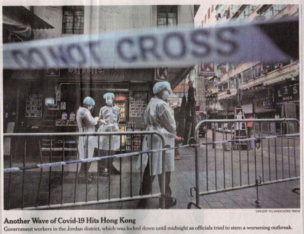 Too good or not good enough, China's coronavirus response is an obsession of the New York Times. On January 25, the front page of the Times' print edition was dominated by an ominous above-the-fold photo of people in protective gear behind police tape reading "DO NOT CROSS," with a caption headline "Another Wave of Covid-19 Hits Hong Kong." This "wave" consisted of residents of Hong Kong (population 7.5 million) coming down with Covid at the rate of 75 a day--whereas in New York City (population 8.4 million), people are catching it at the rate of about 4,000 a day. But the context that Hong Kong's outbreak was roughly 1/50th as bad as what's considered business as usual in the Times' hometown was entirely missing from the scary photo and caption on the paper's front page.