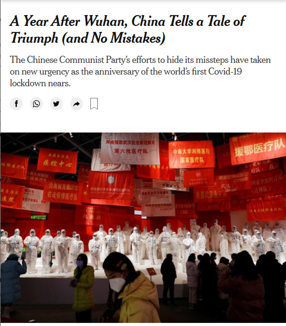 Well, that's how you should feel about our own world's New York Times, which ran an article (1/10/21) with the subhead, "The Chinese Communist Party's efforts to hide its missteps have taken on new urgency as the anniversary of the world's first Covid-19 lockdown nears." The article, by Amy Qin and Javier C. Hernandez, went on to say: