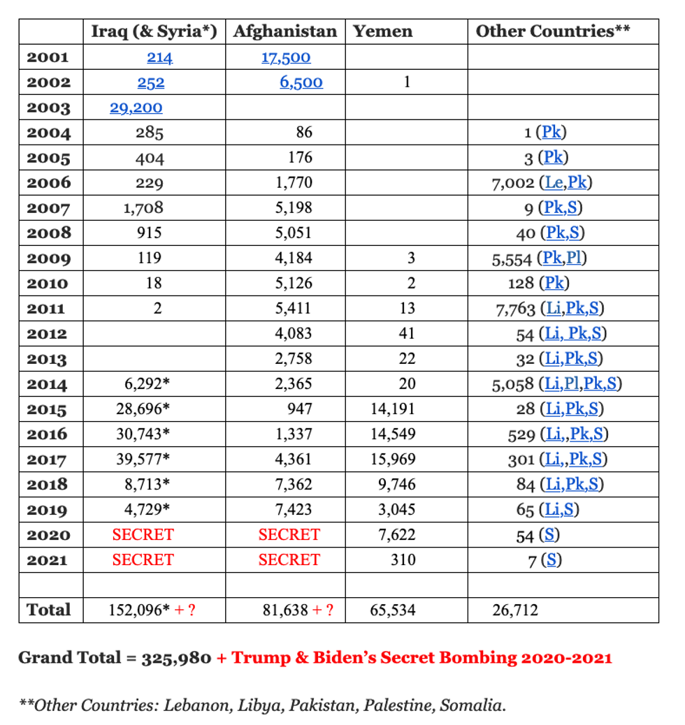 But unbeknownst to many Americans, the U.S. military and its allies are engaged in bombing and killing people in other countries on a daily basis. The U.S. and its allies have dropped more than 326,000 bombs and missiles on people in other countries since 2001 (see table below), including over 152,000 in Iraq and Syria.